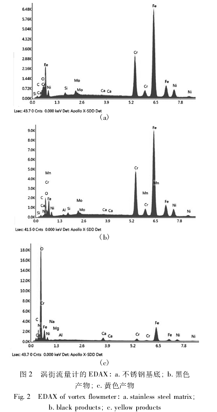 采(cai)用FEI公司QUANTAFEG450型場(chang)發射掃描電(diàn)子顯微鏡(SEM)觀(guān)察數字式渦(wo)街流量計表(biǎo)面剝離的黑(hei)色和黃色腐(fu)蝕産物的表(biǎo)面形貌🈲,并用(yong)其自🔆帶的能(neng)譜分析儀(EDAX)分(fen)析腐蝕産物(wu)的元素組成(chéng)含量。測試條(tiao)件🧑🏾🤝🧑🏼:測試電壓(ya)20kV,光斑尺寸6.00μm,工(gōng)作距離10mm;采用(yòng)PHI5000VersaprobeII射線電子能(néng)譜儀(XPS)分析腐(fu)蝕産物的存(cún)在形态,試驗(yàn)使用Al靶。