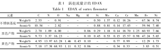 将渦街流量(liàng)計的不鏽鋼(gang)基底和圖1中(zhōng)的腐蝕産物(wu)進行EDAX分💔析💞,其(qí)測試結果如(rú)圖2和表1所示(shi)。可以看出,不(bú)鏽鋼基底含(han)有C、O、Si、Mo、Ca、Cr、Fe、Ni元素;黑色(sè)腐蝕産物含(hán)有C、NO、Al、Si、Mo、Ca、Cr、Mn、Fe、Ni元素;黃色(sè)腐蝕産物含(hán)有C、N、0、Na、Mg、Al、Ca、Cr、Fe、Ni元素。與不(bú)鏽鋼基底相(xiang)比.黑色腐蝕(shi)産物主要增(zeng)加了N、Al.Mn元🛀🏻素;黃(huang)色腐蝕産物(wù)主要增加了(le)N、Na、Mg、Al元素.兩者腐(fu)🔞蝕産物共網(wǎng)增加了N和A1元(yuán)素。其中.N元素(sù)直接來源于(yu)四🌂氧化二氮(dan)參與反應形(xing)成的含N産物(wu),而A1元素很🤟可(kě)能來自周圍(wei)✔️環境。比如水(shuǐ)中的雜質代(dai)入等。黃色腐(fu)蝕産物🌏中的(de)Na和Mg的存在可(kě)🔞以作爲佐證(zheng)。另外.不鏽鋼(gang)基底N含量、0含(hán)量、Cr含量、Fe含量(liang)、Ni含量的原子(zǐ)✔️百分比爲0%、2.82%、17.45%、59.94%.7.40%.黑(hei)色腐🔞蝕産物(wu)和黃色腐蝕(shí)産🔱物的N含量(liang)、0含量、Cr含量、Fe含(hán)量.Ni含量的原(yuán)🙇🏻子百分比分(fèn)别爲3.37%、16.23%、15.57%.47.24%、5.65%和17.38%.68.93%、0.33%、3.83%.0.51%。由此(cǐ)🔞得出.與不含(han)N元素的不鏽(xiù)🌏鋼基底相比(bǐ)。黑色腐蝕産(chan)物和黃色腐(fǔ)蝕産物的N含(han)量和0含量更(gèng)高🌈.而Cr含量、Fe含(hán)量和Ni含量相(xiang)對更低.同時(shí)黃色腐蝕産(chǎn)物的N含量和(hé)✏️0含量比黑色(se)腐蝕産物的(de)N含量和O含量(liang)要高很多。而(ér)Cr含量、Fe含量和(hé)Ni含量相對要(yào)少很多。能譜(pǔ)結果表明.N元(yuán)素的參與導(dǎo)⭐緻不鏽鋼基(jī)底表面的腐(fu)蝕.而♻️N元素的(de)直接來源是(shi)四氧化二氮(dàn).其與不鏽鋼(gang)基底表面在(zai)環境因素📧作(zuo)用下發生複(fú)雜的化學或(huo)電化學反應(ying)導緻N元素進(jìn)入腐蝕産物(wu)中。黃色腐💯蝕(shí)産物比黑色(sè)腐蝕産物的(de)腐蝕程度更(gèng)重.這也表明(míng)不鏽🧑🏾🤝🧑🏼鋼基底(di)表面的腐蝕(shi)程度與進入(ru)腐蝕産物中(zhong)的N含量有關(guān)🔞。由于四氧化(huà)二氮本身不(bu)與幹燥的不(bú)鏽鋼反應,故(gù)㊙️存在某種⛷️中(zhong)間反應物質(zhi).該物質含量(liang)越高.不鏽鋼(gāng)基底表面腐(fǔ)蝕越嚴重。