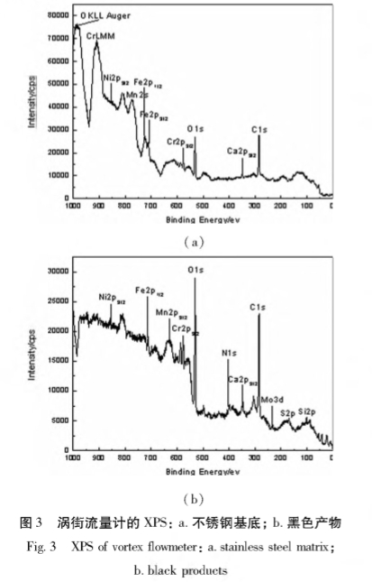 将渦街流(liú)量計的不鏽(xiù)鋼基底和黑(hēi)色腐蝕産物(wù)進行XPS分析,其(qí)測試結果如(ru)圖3所示。由圖(tu)3可見,不鏽鋼(gāng)基底含有C、Ca、O、Fe、Mn、Ni、Cr等(děng)元素;黑色腐(fu)蝕産物含有(you)Si、S、C、Ca、N、O、Cr、Fe、Mn、Ni等元素。N元素(su)的分析與EDAX分(fèn)析結果一緻(zhì);Si、大量Fe單😄質和(he)少量Fe的氧化(huà)物形式存在(zài);黑色腐蝕👄産(chan)物中Fe主要以(yi)Fe2O3形式存在。不(bú)鏽鋼基底和(he)黑色腐蝕産(chan)物Cr2p3/2的電子結(jié)合能分别爲(wei)574.4eV和576.7eV,與标準圖(tú)譜Cr2p32中單質Cr的(de)574.1eV和Cr2O3的576.6eV比較可(ke)知,不鏽鋼基(ji)底中Cr元素主(zhu)要以單質Cr存(cun)在🐉,黑色腐蝕(shi)産物中Cr元素(sù)以❓Cr203形式存在(zai)。同理分析,黑(hēi)色腐蝕産物(wu)中✔️Ni元素以Ni2O3形(xíng)式存在。黑色(se)腐蝕産物中(zhong)NIs的電子結合(he)能爲398.0eV,與NH.NO,的電(dian)子結合能398.5eV相(xiang)對接近,故黑(hei)色腐蝕産物(wu)中N元素最可(kě)能⭐以NO,形式存(cún)在🏃🏻♂️。