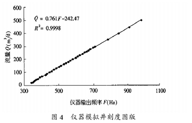 實驗結果表(biao)明,儀器對流(liú)量響應的線(xian)性很好分辨(biàn)率爲2m³/d,流量測(cè)量範圍可達(dá)2~500m³/d,從實驗數據(ju)中計算出的(de)💰流量💰誤差🏃小(xiǎo)于±3%(儀器的典(dian)型刻度圖版(bǎn)見圖4)。
