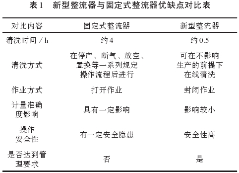 新(xin)型整流器(qi)較傳統固(gu)定式整流(liú)器在清洗(xi)時間、清洗(xi)方式、作業(ye)方式、計量(liang)精度影響(xiang)以及操作(zuò)的安全性(xìng)方面具有(you)更好的效(xiào)果,提高工(gōng)作效率的(de)同時,對作(zuo)業期間的(de)安全性也(ye)有了明顯(xiǎn)保障(表1)。同(tong)時,根據相(xiàng)關管理規(guī)定,計量設(she)備需在😍半(bàn)年内清❓洗(xi)、維護,但受(shòu)實際生産(chǎn)條件的限(xian)制,難以達(dá)到管理規(gui)定要求,新(xin)型整流器(qi)設計的提(ti)出,可有效(xiao)解決無法(fa)按期清㊙️洗(xi)維護的問(wen)題。