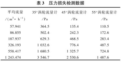 表3列(liè)出了安裝(zhuāng)3種不同螺(luo)旋角渦輪(lún)流量計在(zài)儀表取壓(yā)口處的壓(yā)力損失。
