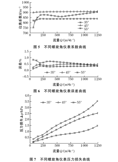 如圖5所示(shì),采用螺旋(xuán)升角爲35°渦(wō)輪的流量(liàng)計的儀表(biǎo)系數☁️曲線(xian)在工作區(qu)内波動較(jiao)大,對儀表(biao)計量的穩(wen)定性産生(sheng)很大㊙️的負(fù)面影響。而(ér)45°和55°的渦輪(lun)流量計的(de)儀表系數(shu)曲線在工(gōng)作區内波(bo)動較小🏒,線(xiàn)性度較理(li)✊想,儀表在(zài)工作區内(nèi)🈲的計量穩(wen)定性較好(hao)。