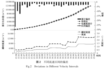 本次(ci)測量兼(jian)顧了不(bú)同的流(liu)速區間(jiān),在不同(tóng)流速(0.30、0.42、0.58、0.84.0.98、1.40m/s)區(qū)🤟間的偏(pian)差分🏒别(bie)是-3.65%、-5.35%、-4.24%、-3.95%.-3.35%、-1.62%,如圖(tú)2所示。