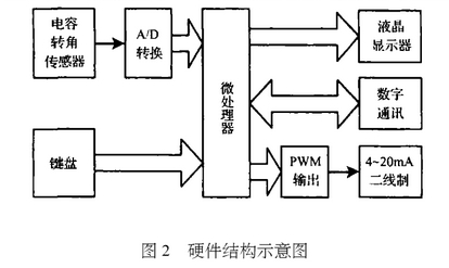 硬件(jiàn)結構如圖2所示(shì),浮子的位置變(bian)化通過擺杆變(bian)爲角度變化後(hou),由電容角位移(yí)傳感器轉換爲(wei)電壓信号,微處(chù)理器通過内部(bu)集成的A/D轉換器(qi)将該信号變爲(wèi)數字量進行流(liú)量計算并累計(jì),将計算結果送(sòng)液晶顯示器顯(xiǎn)示,并通過控制(zhì)PWM輸出,将當前瞬(shun)時流量以4~20mA二線(xian)制方式遠傳;鍵(jian)盤用于外部參(cān)數設置;數字通(tong)訊接口與計算(suàn)機連接進行内(nei)部參數設置。