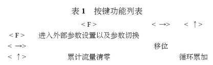 AD轉換器采集(jí)角位移傳感器(qi)輸出電壓信号(hao),采集時間間隔(gé)爲10ms,采集的電壓(ya)值經數字濾波(bo)後,用于流量計(jì)算;鍵盤處理模(mo)塊采用中斷方(fang)式,根據鍵值,實(shi)現表1所示功能(néng)。