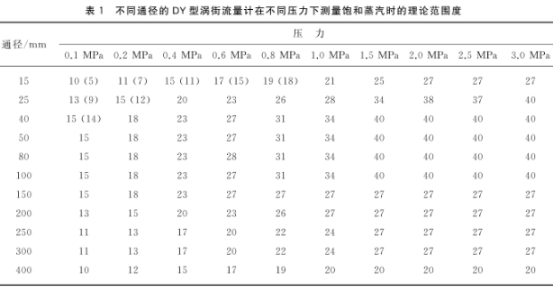 渦街流(liú)量計具(jù)有範圍(wei)度寬的(de)特點。在(zai)用于測(cè)量蒸汽(qi)流量時(shi),一些制(zhì)造廠商(shāng)宣傳的(de)範圍度(dù)可以做(zuo)到40倍.但(dàn)對其所(suǒ)提供的(de)資料進(jin)行具體(ti)分析時(shi),也隻有(yǒu)一部分(fen)中小通(tōng)徑的儀(yí)表,在流(liu)體壓力(li)較高時(shí),理論範(fan)圍度能(neng)夠達到(dao)40倍0],而作(zuo)爲關口(kǒu)蒸汽計(jì)量使用(yòng)的大通(tong)徑儀表(biǎo),範圍度(dù)要小得(de)多。例如(ru)DY300型DN300渦街(jiē)流量計(ji),在用來(lai)測量表(biǎo)壓爲p=1.0MPa的(de)飽和蒸(zhēng)汽時.理(li)論範圍(wéi)度爲24倍(bei)。不同通(tōng)徑的DY型(xíng)渦街流(liu)量計,在(zài)不同壓(yā)力條件(jian)下測量(liang)飽和蒸(zheng)汽時的(de)理論範(fàn)圍度見(jiàn)表1所列(lie)。