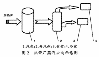 熱帶廠(chang)目前使用的蒸(zheng)汽主要由加熱(re)爐爐内管道汽(qì)化産生,蒸汽過(guo)渡儲存在汽包(bao)中。設計要求汽(qì)包工作壓力☁️爲(wèi)0.50~0.80MPa,正常工作壓⁉️力(li)爲0.70MPa左右。汽包産(chǎn)生的蒸汽流量(liàng)爲3.0t/h。蒸汽通過DN100的(de)管道輸送,蒸汽(qì)終端用戶爲☂️食(shí)堂和浴室,蒸汽(qi)主要用于加熱(rè)。圖2對熱帶廠的(de)蒸汽去向作了(le)簡單的說明。.