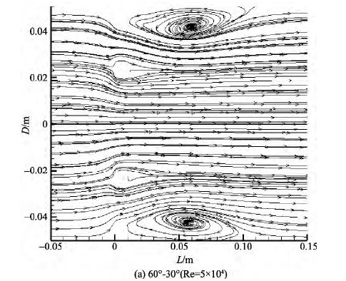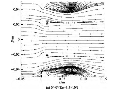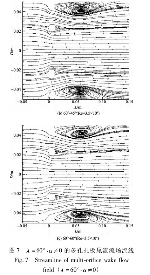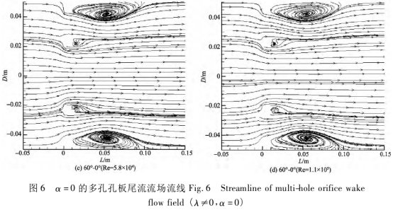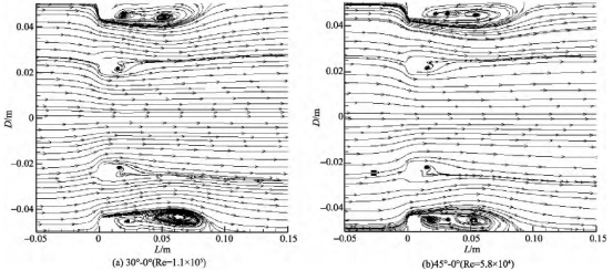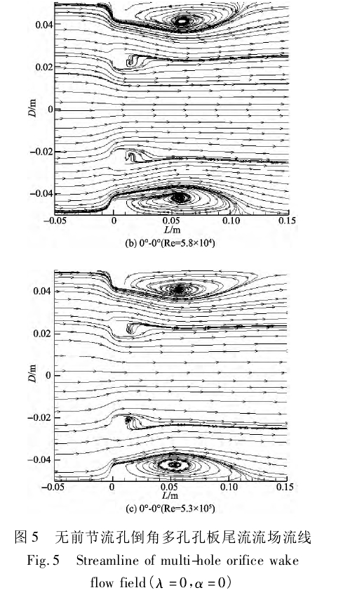 圖(tu)5爲前倒角(jiǎo)λ與後倒角(jiǎo)α均爲0°的多(duo)孔孔.闆在(zai),入口雷諾(nuò)數3.5x104≤Re≤5.3x105的範圍(wei)💋内的尾流(liu)流場的流(liu)線圖,無倒(dao)角多孔孔(kǒng)闆流場中(zhong)的☁️回流區(qū)特❤️征如表(biao)1所示。