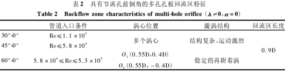 式中:△p爲(wei)永久壓力(lì)損失,u爲入(ru)口速度,ρ爲(wèi)流體密度(dù),L爲回流區(qu)長度的無(wu)量綱值。從(cong)式(10)中可以(yǐ)得出,在相(xiàng)同的入口(kǒu)速度下,永(yǒng)久壓力損(sun)失随回流(liú)區長度的(de)增大而增(zēng)大凹。因此(cǐ),本研究在(zai)入口雷諾(nuò)數在3.5x104≤Re≤5.3x105範圍(wéi)内,以β=0.67,管徑(jìng)D=100mm,厚度t=8mm的多(duō)孔孔闆爲(wèi)例分析孔(kong)倒角對尾(wěi)流流場中(zhong)回流區長(zhang)度及回流(liu)渦的影響(xiǎng)規律。