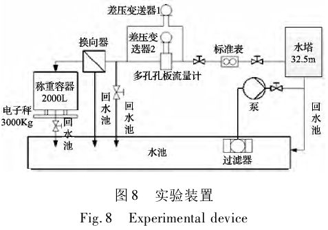 爲了驗(yàn)證數值模(mó)拟所得到(dào)的結論,本(ben)研究在如(rú)圖8所示實(shi)🤟驗裝置上(shàng)對節流比(bi)爲0.55、0.67、0.75管徑爲(wei)100mm的多孔孔(kong)闆進行實(shí)流實驗。該(gai)裝置采用(yòng)水塔穩壓(yā),流量穩定(dìng)性爲0.1%,流量(liang)範圍爲5L/h~800m³/h,不(bú)确定度爲(wei)0.05%。本文采用(yong)稱重法對(dui)實驗樣機(ji)的流出系(xi)數及壓力(li)損失進行(hang)測量。差壓(ya)變送器1用(yòng)來測量多(duo)孔孔闆上(shàng)遊1D與下遊(you)6D之間的壓(yā)差✂️,即壓力(lì)損失,差壓(yā)變送器2用(yòng)來測量介(jiè)質經過多(duo)孔孔闆後(hou)産✍️生的靜(jing)💁壓差△p,取壓(ya)方式爲法(fǎ)蘭取壓。