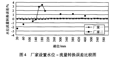 通(tong)過圖4可以(yǐ)看出:廠家(jia)一的軟件(jian)設置爲30點(dian)對照,且液(yè)位點均勻(yun)分布,而廠(chang)家二設置(zhì)爲10點,不均(jun)勻分布,則(ze)廠😍家一顯(xian)示的水位(wèi)流☀️量轉換(huàn)誤差明顯(xian)小于廠家(jia)二。