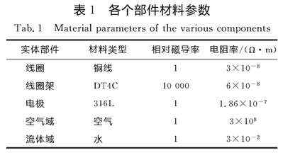 有限元網格(ge)的質量直接(jie)影響計算精(jing)度,采用自動(dong)網格劃分,單(dan)元形狀爲四(sì)面體,粗網格(gé)和細網格之(zhī)間過渡并不(bu)光滑,因此将(jiāng)流體域和空(kōng)氣域之間的(de)測量管域的(de)網格單元大(da)小設置爲2mm。網(wang)格劃分後,導(dao)入Anrsys中進行單(dan)元類型、材料(liao)、實常數、載荷(hé)、邊界條件和(hé)場路耦合單(dān)元設置。線圈(quān)用銅線實現(xian),匝數共6500匝,其(qi)截面積爲2.72×10-4:mm²,體(ti)積爲1.49×10-5mm3;線圈坐(zuo)标系單獨定(ding)義爲局部柱(zhù)坐标系,軸向(xiàng)爲正Y方向,其(qi)餘部件的坐(zuo)标系使用全(quán)局笛卡爾坐(zuò)标系,軸向爲(wèi)正Y方向。各個(gè)部件的材料(liao)參數設置見(jian)表1。