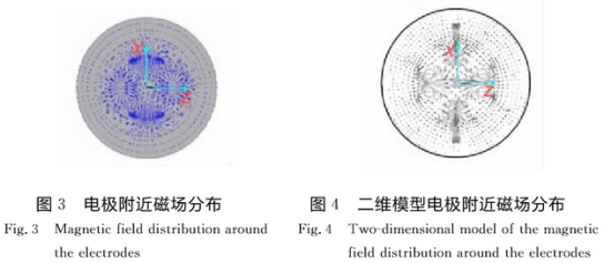 爲了(le)保證模型的(de)正确率,對建(jiàn)立的四電極(jí)外流式電磁(cí)流量傳感器(qi)的三維有限(xiàn)元模型,從2個(gè)方面進行了(le)校驗:首先,給(gěi)有限元模型(xíng)施加恒值電(dian)流激勵,選用(yòng)靜态求解類(lèi)型,将模型最(zui)外圈節點的(de)Ax,Ay,Ax自由度均設(she)爲0,選擇所有(yǒu)單元後進行(hang)求解,然後在(zài)後處理器中(zhong)讀入結果,畫(huà)出電極附近(jìn)的磁場;分布(bu),如圖3所示,磁(cí)場分布符合(hé)金甯德等數(shu)值分析的結(jie)果'5],如圖4所示(shì);其次,在現有(you)模型基礎上(shang)加密網格單(dan)元,所得感應(yīng)電動勢大小(xiao)前後誤差小(xiao)于5%,從而保證(zhèng)有限元計算(suàn)結果不受網(wǎng)格質量變化(hua)的影響。綜上(shang)所述,該有限(xian)元模型是準(zhǔn)确的,可用來(lai)進行仿真研(yan)究。
