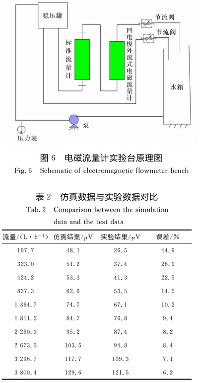 在紊流(liú)場共選定了(le)10個不同的流(liu)量值,獨立電(dian)壓源編程爲(wei)兩值矩形波(bo),幅值爲15V,頻率(lǜ)爲1Hz,對流量數(shu)據進行了仿(pang)真計算,并在(zài)實驗台上得(dé)出了實驗數(shù)據,實驗台采(cǎi)用精度爲0.5%的(de)電磁流量計(jì)讀取流量值(zhi),用信号處理(li)電路采集四(sì)電極外流式(shi)電磁流量計(ji)的感應電動(dong)勢信号,通過(guo)串口輸入到(dào)計算機顯示(shi),實驗台原理(li)圖如圖6所示(shi),最後對這2種(zhǒng)數據進行了(le)誤差分析,結(jie)果見表2。