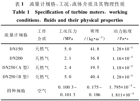 2015年(nian)至2018年,上海市(shi)計量測試技(ji)術研究院使(shǐ)用常壓空氣(qì)流量标準裝(zhuang)置(量程2~4500m3/h,相對(duì)擴展不确定(ding)Urel=0.16%,k=2))對32台進口渦(wō)輪流量計實(shi)施檢定,流量(liang)計入關前都(dōu)經過德國國(guó)家高壓天然(ran)氣流量标準(zhǔn)裝置(量程3~6500m³/h,相(xiang)對擴展不确(què)定度Urel=0.12%,k=2)的實流(liú)标定。常壓空(kong)氣流量标準(zhǔn)裝置的量值(zhi)溯源到中國(guo)氣體流量國(guó)家基準,德國(guó)國家高壓天(tian)然氣流量标(biāo)準裝置使用(yong)的流量标準(zhǔn)值是荷蘭法(fa)國-德國協同(tóng)參考值(harmonizedreferencevalue)。根據(ju)流量計的型(xing)号規格以及(ji)标定時的工(gong)況壓力,将32台(tai)流量計分爲(wei)4組,對應的工(gōng)作介質及其(qí)物理性質如(rú)表1所示。标定(dìng)數據經彙總(zong)整理後繪制(zhì)成體積流量(liang)-誤差曲線,如(rú)圖1所示。