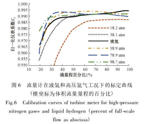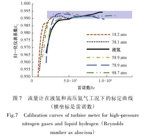 各(gè)個工況下的(de)标定曲線如(ru)圖6所示,試驗(yan)結果用儀表(biǎo)系數K,表示,原(yuán)技術報告是(shi)以水标定的(de)儀表系數作(zuo)爲參照,經歸(gui)--化處理後作(zuo)爲縱坐标,橫(héng)坐标是體積(ji)流量量程的(de)百分比,爲方(fāng)便分析,将标(biāo)定數據轉爲(wei)圖7所示(橫坐(zuo)标以雷諾數(shù)表示)。物性方(fang)面,58.9和78.9atm的高壓(yā)氮氣分别與(yu)液氫的密度(dù)和運動粘度(du)很接近,所以(yi)标定結果對(duì)比符合流動(dong)相似準則的(de)要求。6組标定(ding)數據在量程(cheng)的低區(<50%FS,Re<5x10')差異(yi)較大,标定曲(qǔ)線呈現出“扇(shan)形”特征,随着(zhe)雷諾數上升(sheng),差異逐漸減(jian)小“扇形”趨于(yu)收斂。4個高壓(yā)氮氣(工況壓(yā)力≥38.1atm)以及液氫(qīng)的标定數據(ju)在量程的高(gāo)區很接近,5條(tiao)标定曲線聚(ju)合于一個0.5%的(de)區間(如圖7中(zhōng)帶狀部分所(suǒ)示)。如果以該(gāi)區間作爲僅(jin)與雷諾數相(xiang)關的聚合域(yù),4條高壓氮氣(qì)标定曲線随(suí)着壓力的上(shàng)升,依次進入(rù)該區間,正如(rú)前文的分析(xi),工況壓力越(yue)高,進入聚合(hé)域所對應的(de)雷諾數也越(yue)大。