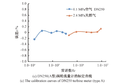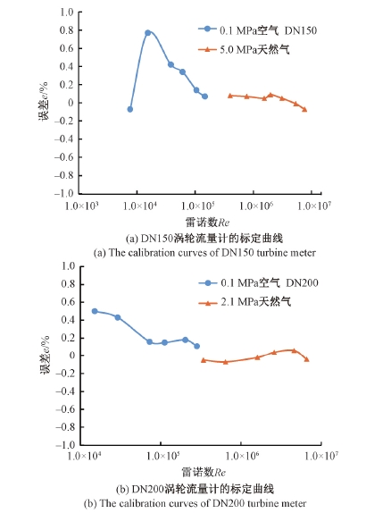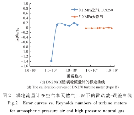 圖2所示爲。上(shàng)述渦輪流量(liàng)計基于雷諾(nuò)數(Reynoldsnumber,Re)的誤差對(dui)比。由于渦輪(lún)流量計一般(ban)是以體積流(liú)量标稱其量(liàng)程範圍,轉化(huà)到雷諾數後(hòu),常壓下雷諾(nuo)數量程與高(gāo)壓下雷諾數(shu)量程存在間(jian)隔,兩個工況(kuang)壓力相差越(yue)小,間隔區間(jian)越小,常壓雷(léi)諾數上限的(de)誤差與高壓(ya)雷諾數下限(xian)的誤差越接(jiē)近,圖2(b)與圖2(c)中(zhong)兩者相差分(fen)别爲0.24%和0.05%,可以(yi)認爲流量計(ji)的誤差幾乎(hu)随雷諾數連(lian)續變化。圖2中(zhong)兩條誤差曲(qu)線沒有重疊(dié)或交集,意味(wèi)着流量計分(fen)别工作在不(bu)同的流動特(tè)征區域,無法(fǎ)進行常壓空(kong)氣與高壓天(tian)然氣之間的(de)點對點誤差(chà)對比。因此,需(xu)要增加高壓(ya)空氣下的标(biao)定實驗。