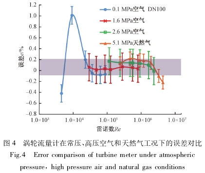 4個工(gong)況下的标定(ding)結果如圖4所(suo)示,誤差棒用(yòng)各個裝置的(de)相對測量不(bú)确定度表示(shì)。0.1MPa常壓空氣的(de)上限雷諾數(shu)和2.6MPa高壓空氣(qì)的下限雷諾(nuò)數比較接近(jin),各自對應的(de)誤差相差0.24%。4個(ge)壓力工況(0.1.1.6、2.6和(he)5.1MPa)下的标定曲(qǔ)線包含3段明(míng)顯的雷諾數(shu)重疊區域,區(qū)域内兩兩曲(qu)線之間的差(chà)異小于0.2%,而且(qiě)2.6MPa空氣與高壓(yā)天然氣(5.1MPa)的标(biao)定曲線更爲(wei)接近,點對點(dian)差異甚至小(xiao)于0.1%。由于3個工(gong)況(常壓、高壓(ya)空氣和天然(rán)氣)下的實驗(yàn)相互獨立,标(biao)定數據兩兩(liang)之間的差異(yi)小于裝置間(jian)的合成擴展(zhǎn)不确定度,說(shuō)明渦輪流量(liàng)計标定曲線(xiàn)随雷諾數變(biàn)化,而且随着(zhe)工況壓力增(zeng)加,标定曲線(xiàn)保持連續性(xìng)延拓。當Re>2.95x104,各個(gè)工況的标定(dìng)數據之間的(de)差異不超過(guo)0.30%,如圖4帶狀區(qū)域所示,且随(suí)着雷諾數增(zēng)加,這種差異(yi)呈現出逐漸(jian)縮小的趨勢(shì),曲線也逐漸(jiàn)相互接近。基(ji)于渦輪流量(liang)計在高雷諾(nuo)數區域表現(xiàn)出的這一特(tè)性,技術人員(yuan)就能夠以較(jiao)高的置信度(dù)估計出流量(liang)計在其他相(xiàng)近工況壓力(lì)下的誤差。