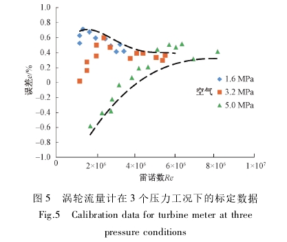 需(xu)要指出的是(shi),上述實驗是(shi)在流量計制(zhi)造商限定的(de)體積流量量(liàng)程内進行,僅(jin)在部分雷諾(nuò)數重疊區存(cun)在誤差的點(diǎn)對點比較,爲(wèi)了擴大比較(jiao)範圍,有必要(yao)将标定實驗(yan)拓展到流量(liang)計量程的下(xia)限以下。爲此(ci),在高壓空氣(qì)環道流量标(biāo)準裝置的3個(gè)工況(1.6.3.2.5.0MPa)下對一(yī)台DN150的渦輪流(liú)量計進行多(duo)點标定,結果(guǒ)如圖5所示。
