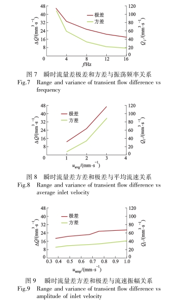圖8爲入(rù)口平均(jun1)流速與(yǔ)瞬時流(liú)量方差(chà)及極差(chà)的關系(xì).當振蕩(dang)✨頻率和(he)流速振(zhèn)幅相同(tóng)時,人口(kou)平均流(liu)速越大(da),瞬時流(liu)量差的(de)方差和(he)極差越(yue)大.圖9爲(wèi)瞬時流(liú)量差方(fang)🧑🏽🤝🧑🏻差和極(ji)差與流(liú)速振幅(fú)關系.從(cóng)圖中可(ke)以看出(chu),當人口(kǒu)平均流(liu)速相同(tong)時,對🔞于(yú)給定的(de)振蕩頻(pín)率🔴,瞬時(shí)流量差(chà)的方差(cha)和極差(cha)随着流(liú)速振幅(fú)增大而(ér)增大.因(yin)此,當📱人(rén)口流速(su)峰值越(yue)🌈大,瞬時(shi)流量差(cha)波動也(ye)越大,瞬(shùn)時流量(liang)差就越(yuè)不穩定(dìng).