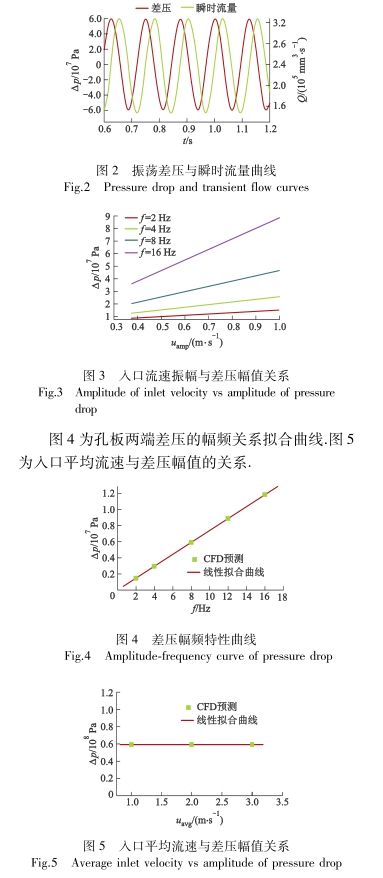 從(cong)圖4中可(ke)以看出(chu)當人口(kǒu)流速振(zhèn)幅一定(dìng)時,節流(liu)孔兩端(duan)差壓的(de)振蕩幅(fú)值随振(zhen)蕩頻率(lǜ)的增大(dà)而增大(da).差壓幅(fu)值與振(zhèn)蕩頻率(lǜ)存在近(jìn)似一次(ci)線性關(guān)系.