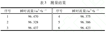 爲驗(yàn)證流量計(jì)穩定性,在(zài)實驗平台(tai)正常工作(zuo)的情況下(xià)調節流速(sù),使得平均(jun1)流量在96m3/h的(de)前提下連(lián)續采集6組(zǔ)瞬時流量(liang)數據🏃🏻♂️,所測(cè)結果如表(biǎo)3所示。