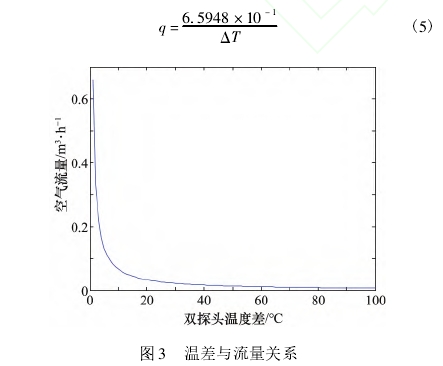如上所示(shì),量程範圍(wéi)受最大電(diàn)流限制。想(xiang)要拓寬量(liang)程,不妨将(jiāng)兩種方法(fǎ)相結合。在(zài)速度探頭(tou)的電流達(dá)🍉到0.09A之🌈前采(cǎi)用恒溫差(chà)法進行測(ce)量,在0.09A之後(hou)采取恒功(gong)率法進行(háng)測量♊。0.09A時速(sù)度探頭功(gōng)耗爲0.237W,以✌️此(cǐ)功耗爲恒(heng)🏃♂️定功耗,流(liú)過速度探(tàn)頭的流量(liàng)與溫度差(chà)之間的關(guan)系如式(5)和(he)圖3所示,對(dui)于溫差爲(wèi)50~100℃時具有👈較(jiao)好的靈敏(mǐn)度。溫差爲(wèi)50℃時,此時速(su)度探頭支(zhi)路電流爲(wèi)0.096A,小于最大(da)電流,所測(ce)流量爲☁️1.31869×10-2m3/h。