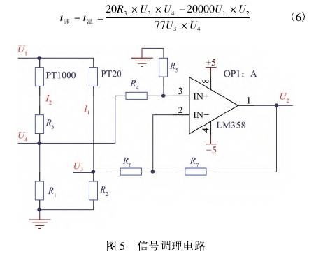 信号調理(lǐ)電路如圖(tú)5所示,信号(hào)調理電路(lù)相鄰兩端(duan)爲PT20和😍PT1000,另㊙️外(wài)兩端電阻(zǔ)爲20Ω的電阻(zu)R2和1kΩ的電阻(zǔ)R1,在PT1000電阻一(yi)端有補償(cháng)電阻R3,R1和R2兩(liang)端的電勢(shi)差經差分(fèn)放大後爲(wei)U2。差分放大(dà)電路♻️中R4=R6,R5=R7。可(kě)調直流電(dian)源提供🐉電(diàn)壓U1。無任何(hé)🔞氣體流過(guò)時,速度探(tan)頭的溫度(du)比溫度探(tan)💋頭高100℃,補償(cháng)電阻R3保證(zheng)電🌂橋平衡(héng),此時☀️電勢(shi)差U2爲0,電勢(shi)差U2由AD7066芯片(piàn)進行采集(jí)。R1、R2兩端電壓(ya)U3、U4由AD7066采集後(hòu),除去阻值(zhí)即可得到(dao)🔞速度探頭(tóu)和溫度👉探(tàn)頭支路電(diàn)流I1和🔞I2。若I1值(zhi)小于0.09A,采用(yòng)👌恒溫差法(fa),根據I1值求(qiu)🌈得流量。當(dang)進氣流量(liàng)增大時,速(su)度探頭發(fa)💔生熱對流(liu),被氣體帶(dài)走一部分(fèn)熱量,溫度(dù)🙇♀️降低,阻值(zhi)減小,電橋(qiáo)平衡被打(da)破。控制電(dian)路根據電(diàn)勢差U2增大(da)U1輸入,I1增大(da)使得速度(du)探頭功耗(hao)增大,溫度(dù)上升,阻值(zhi)上升,電橋(qiáo)重新平衡(héng)👅;而當進氣(qi)流量減小(xiao)🐪,速度探頭(tou)溫度升高(gāo),阻值增加(jia),則減小U1輸(shū)入,減小I1,減(jiǎn)小速度探(tan)頭功耗,速(su)度探頭溫(wen)度降低,阻(zu)值減小☁️,電(dian)橋重新平(píng)衡。若I1值大(dà)于0.09A,采用恒(heng)功率法進(jin)行測量,根(gen)據溫💜度差(cha)求得流量(liang)。進氣流量(liàng)增大,速度(du)探頭溫度(dù)降低,阻值(zhí)減小,功耗(hao)增大,減小(xiǎo)U1輸入,使得(de)速度探頭(tou)功耗維持(chí)定值;進氣(qi)流量減小(xiǎo),速度探頭(tou)溫度升高(gao),阻值增大(dà),功耗減小(xiǎo),增大U1輸入(rù),使得速度(dù)探頭功耗(hao)維持定值(zhi)。溫度差公(gōng)式如式(6)所(suǒ)示。