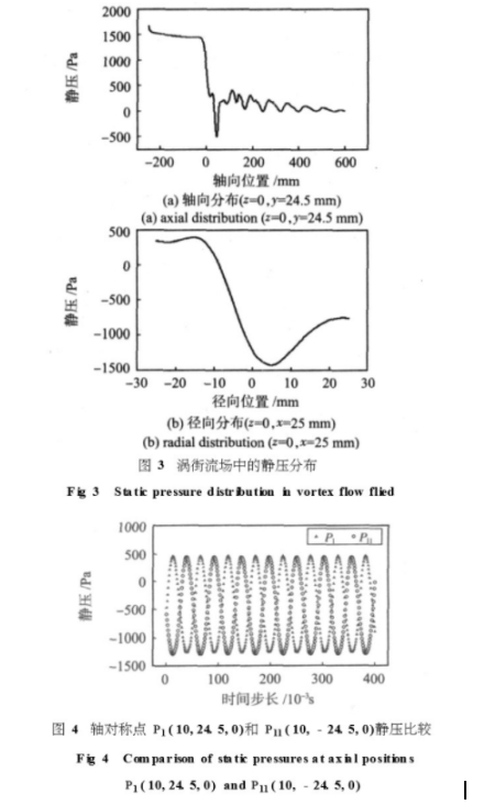 爲了定量(liàng)比較渦街流(liú)場空間中不(bu)同位置處靜(jing)壓的大小💃,圖(tú)3給🤟出了靜壓(ya)在計算域中(zhong)平行流向的(de):=0,y=245mm和垂直流向(xiàng)的:=0,x=25mm兩條直線(xian)上的計算結(jie)果。可以看到(dào),渦街流場中(zhong)靠近旋渦發(fa)生體管壁處(chù)的靜壓有較(jiào)明❌顯的波動(dòng),,沿流動方向(xiàng)靜壓在0~50mm區間(jian)内波動明顯(xian)、幅🌐度最大,即(jí)在距離旋渦(wo)發🏃🏻生體一定(dìng)範圍内,越靠(kào)近旋渦發生(sheng)體👄,靜壓幅度(du)越大;而在垂(chui)直流動方向(xiàng)上⭐管道内壁(bì)處的靜🤩壓也(yě)具😍有較大的(de)幅度。圖4給出(chū)了計算域中(zhōng):=0平面上一對(dui)軸對稱管壁(bi)處監🔞測點P1(10,245,0)和(he)Pi(10,24.5,0)靜💃🏻壓的計算(suàn)值。從圖中可(kě)以看出:管壁(bi)處軸對稱的(de)2點靜壓波動(dòng)的幅度和頻(pín)率✌️相等而相(xiang)位相反,因此(cǐ),若👈在靠近旋(xuán)渦發生體的(de)軸對稱管壁(bì)上設置兩個(ge)取⭕壓點㊙️測量(liang)差壓,則可構(gou)成差動結構(gòu),獲得的信号(hao)更強便于檢(jian)測,通過測得(dé)的靜壓差可(ke)以檢測管内(nei)渦街流動特(tè)性。