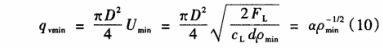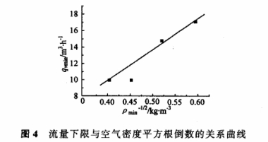 式中(zhōng)α爲常數,可(kě)見流量下(xia)限qvmin與相應(ying)狀态下空(kōng)氣密度平(píng)方根的倒(dǎo)數即ρmin-1/2成正(zheng)比,這就是(shi)渦街流量(liang)計流量下(xià)💋限随🐉介質(zhì)密度增大(dà)而降低現(xian)象出現的(de)理論分析(xi)。結合表1中(zhong)實際數據(jù),繪出qvmin~ρmin-1/2曲線(xian),見圖4。