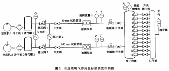 本(ben)文試驗裝(zhuāng)置采用正(zhèng)壓法,工作(zuò)流量範圍(wéi)爲工況2.5~666m³/h,工(gōng)作壓力範(fan)圍爲表壓(ya)0.1~0.5MPa,裝置結構(gòu)圖如圖2所(suo)示。工作原(yuán)理是:首先(xiān)由空壓😍機(ji)将大氣中(zhōng)的空氣送(song)人管道,經(jing)冷幹機除(chu)去水氣後(hòu)打人高壓(yā)儲氣罐中(zhong),待儲氣罐(guàn)壓力升✍️高(gāo)到-定值之(zhī)後,調節💰穩(wen)壓閥使其(qí)下遊管道(dào)壓力穩定(dìng)在合适值(zhí),經🚩穩壓閥(fá)調節後進(jìn)人試驗💘管(guan)道的高壓(yā)氣體先後(hou)流經渦🏃🏻街(jie)流量計、滞(zhì)止容器、音(yīn)速噴嘴組(zǔ)、彙氣管、消(xiāo)音☔器後,最(zui)終通向大(da)氣。其中,音(yin)速噴嘴組(zǔ)由安裝在(zài)滞止容器(qi)下遊的11個(ge)不同喉徑(jìng)音速噴嘴(zuǐ)并聯而成(chéng),通過控制(zhi)音速噴嘴(zuǐ)下遊的開(kai)關閥門,可(kě)以任🌏意選(xuǎn)擇音速噴(pen)嘴的組合(hé)方式,以達(da)到改變被(bei)測儀表流(liu)量的目的(de)。通過對滞(zhì)止容器上(shàng)溫度變送(sòng)器T、壓力變(biàn)送☀️器P1信号(hao)采集,代人(ren)公式(5)便可(kě)得到通過(guo)音速噴嘴(zui)的質量流(liu)量,亦即流(liu)過渦街流(liu)量計處的(de)質量流量(liang)。通過測量(liang)渦街流量(liang)計處的✏️溫(wen)度T和壓力(li)P,可以計算(suan)出工作🌏狀(zhuàng)态下空氣(qì)密度,進🈚而(ér)得🎯到實際(ji)✔️體積流量(liang)。再根據相(xiang)同時間間(jian)隔内渦街(jiē)流量計輸(shū)😄出脈沖的(de)檢測,可最(zui)終實現對(dui)渦街流量(liàng)計儀表系(xi)數等流量(liàng)特性的研(yan)究。