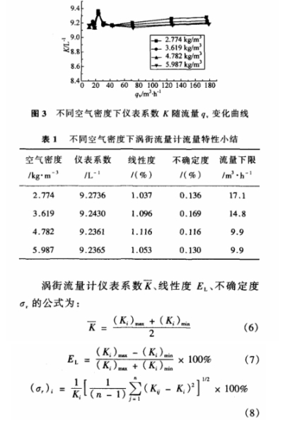 根據(ju)試驗得到(dao)的數據,可(kě)繪制出如(ru)圖3不同空(kong)氣密度下(xia)渦街儀表(biao)系數随流(liu)量變化曲(qǔ)線,并得到(dào)渦街流量(liang)計的流量(liàng)特性見表(biǎo)1。