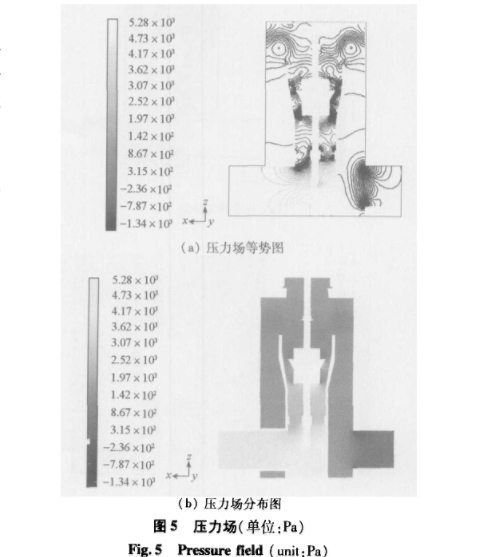 通(tong)過改變(biàn)流量系(xi)數來改(gǎi)變流量(liang)值,進而(er)調整入(ru)口及出(chū)♻️口條件(jian)💞來使浮(fu)子組件(jiàn)達到受(shòu)力平衡(heng).經典的(de)流量系(xì)數在0.9~1.0之(zhī)間,選取(qǔ)包🔱括邊(bian)界值在(zài)内的5個(ge)流量💜系(xì)數來進(jin)行數值(zhi)仿真😘,得(dé)到5組仿(páng)真數據(ju).在下面(miàn)的分析(xi)中給出(chu)第5組數(shu)據,亦即(jí)當浮子(zǐ)受力達(da)到平衡(héng)時的壓(ya)力場和(he)速度場(chǎng)分布情(qíng)況(見圖(tú)5和圖6)..