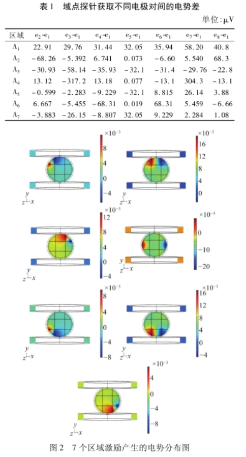 爲了獲取(qǔ)橫截面電極(jí)上的仿真電(diàn)勢值,可在模(mó)型開⭕發器中(zhong)❌選擇域點探(tàn)針,并更新結(jie)果,即可在工(gōng)作區探針表(biǎo)🌏得到⭐感應電(diàn)勢。在8個電極(ji)中把e1作爲參(can)考電.極,與其(qí)他7個電極構(gòu)成了7對電極(jí)組合,可以得(de)到7x7共49個電壓(yā)測量值,如表(biǎo)1所示。
