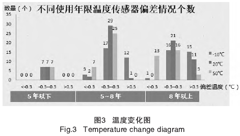 溫度傳感器(qì)以不同年限分(fen)組,分别測試低(di)溫(-10℃)常溫(20℃)、高😍溫(50℃)下(xia)各🎯溫度傳感器(qì)的溫度偏差,溫(wēn)度偏差以±0.3℃爲界(jie),各組溫度傳感(gǎn)器各溫度點測(ce)試情況見圖3(5~8年(nián)有兩個溫度傳(chuán)感器異常)。