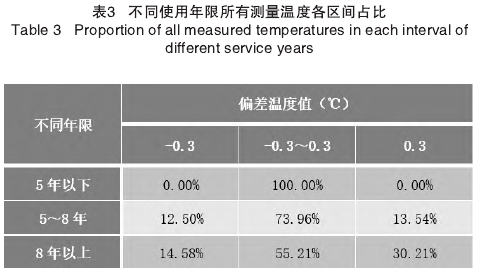 1)在溫度+0.3℃範圍區(qū)間内,随着使用(yòng)年限的增加,符(fú)合該區間的溫(wen)度傳感器占比(bi)減少。