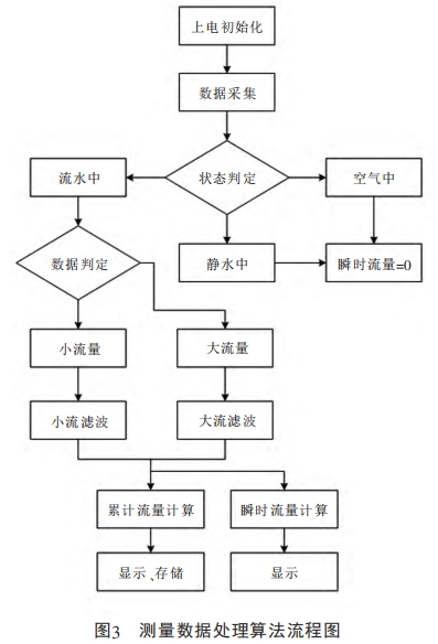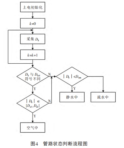圖3所示(shi)的流程爲測量系(xi)統采樣數據的處(chu)理過程,因此未涉(shè)及勵磁、通信等功(gong)能模塊。系統對采(cǎi)集的📧原始數據進(jin)行判斷,區分電極(jí)處于空氣、靜水或(huò)流水等三種不同(tóng)狀态,如圖4所示。