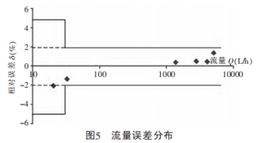 經過上述測量(liàng)方法與數據處理(lǐ)後的DN20管徑試驗樣(yàng)機測量結果🌈如表(biao)1所示。從表中可以(yi)看出,在常用流量(liang)Q3(4000L/h)内,流量傳感❓器具(ju)有很好的流量特(te)性,在R200範圍内相對(duì)誤差≤2%,在R160範圍内相(xiang)對誤差≤1%。其流量誤(wu)差分布如圖5所示(shi),在🈲全流量範圍内(nei),測量誤差全部在(zài)MPE(最大允許誤差)内(nei)。