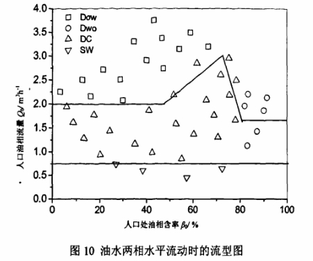 爲(wei)了考察渦輪(lun)流量計計量(liàng)精度與流型(xíng)之間的關系(xì)🔴,繪❄️制⭐了粘度(dù)爲50mPa·s時的流型(xíng)圖,并且與以(yi)前的學者得(dé)到的流型圖(tú)進行了比較(jiao)。實驗中流型(xing)是觀察實驗(yan)管段得到的(de),同時采用Lafin和(he)Oglesby提出的方法(fǎ)來定義流型(xíng)5)。在一定的混(hun)合流速和輸(shū)入油相含率(lǜ)下,在水平實(shí)驗管段觀察(cha)到了四種流(liú)型,即:分層👅流(liú)(SW),雙連續流💛(DC),油(yóu)含水(W/O)以及水(shui)含油(O/W)。圖10給出(chu)了☎️實驗中得(dé)到的流型圖(tu),其中固定線(xian)爲Lovick和Angeli在2001年得(de)到的流型圖(tú).