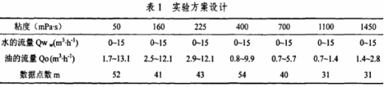 實驗(yàn)水相爲普通(tong)自來水,20℃時的(de)粘度爲1.005mPas,油相(xiang)采用無色、透(tòu)明✉️的礦物油(yóu),俗稱白油,在(zai)常溫常壓(20C,0.101mPa)下(xià),我們分别選(xuan)用其粘度爲(wèi)50、160、225、400、700、1100和1450mPars,共七種樣(yang)品。同時,爲便(bian)于實驗時的(de)流型觀察,在(zai)水中加入了(le)高錳酸鉀(顔(ya)色劑)以便于(yú)識别。實驗工(gong)質溫度控制(zhi)🥰在19℃~21℃,在特定的(de)粘度下,給定(dìng)油相流量後(hòu),調整水相流(liú)量,觀察實驗(yan)段的油⁉️水兩(liang)相流型,記錄(lù)入口處不同(tong)流型的油相(xiàng)和水相表觀(guān)流速和實驗(yàn)段的混🤞合流(liu)速。表1給出了(le)不同粘度下(xià)的實驗數組(zǔ)。