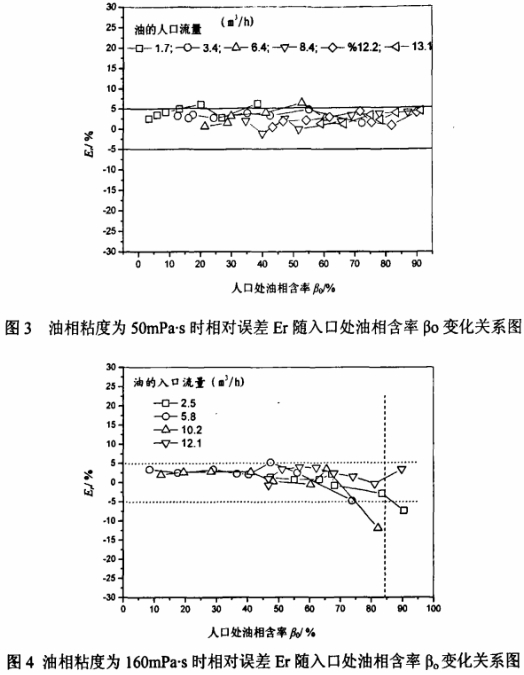 圖3至(zhi)圖9給出了在(zai)七種不同粘(zhan)度下,渦輪流(liú)量計的測☂️量(liàng)誤差随入口(kou)處油相含率(lǜ)的變化關系(xì)圖。以實際應(ying)用中可以接(jie)受的誤差+5%作(zuo)爲其有效工(gong)作區間的判(pan)斷标準(在圖(tú)中,+5%的區間用(yong)虛線标出),并(bing)且在每🏃🏻個圖(tu)标上,用一條(tiáo)豎直的虛線(xiàn),作爲有效工(gong)作區域😄的分(fen)界線。圖3給出(chū)了油相粘度(du)爲50mPa's時相對誤(wù)差随入口處(chù)油相含🌈率變(bian)化關系圖。可(ke)以看出,在整(zheng)個📐油相含率(lǜ)的變化範圍(wei)内,誤差🧑🏽🤝🧑🏻可以(yi)控制在+5%以内(nèi),隻有個别的(de)點超過了5%的(de)範🌂圍,因此可(kě)以認爲在油(yóu)相粘度💔爲50mPars時(shi),渦輪流量計(jì)在任👉何油相(xiang)💋含率下均處(chu)于🏒有效工作(zuo)區間。對于油(you)相粘度爲160mPa's的(de)實驗研究結(jie)果顯示♉(如圖(tu)4所示),随着油(yóu)相含率βo的增(zeng)加,相對誤差(chà)有逐漸增大(dà)的趨勢,同時(shí),絕對誤差值(zhí)也由βo較小,時(shí)的正值,變爲(wei)βo較大時的負(fù)值。但是大部(bù)分的入🏃♂️口油(you)相含率βo的變(bian)化範圍内,相(xiàng)對誤差在+5%以(yi)内,這與黏度(du)爲50mPars時的情況(kuang)大體--緻.