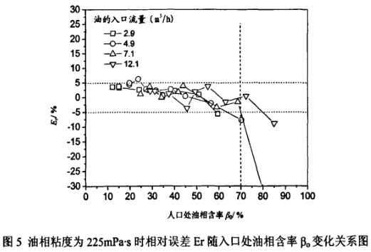 當油(you)相粘度提高(gao)至225mPa·s時(圖5所示(shì)),觀察到了與(yu)圖4相似👄的曲(qǔ)線變💁化⭐趨勢(shì),不同的是:當(dang)β。的小于70%時,相(xiàng)對誤差在5%以(yi)内,渦輪流量(liang)計處于有效(xiao)工作區間。然(ran)而,随着☎️β。的增(zēng)加,誤差曲💰線(xiàn)下降的幅度(dù)增大,當βo達到(dao)70%時,整體誤差(chà)超過了5%的界(jie)線,達到10%以上(shang),此時,渦輪流(liu)量計超✂️出了(le)其有效💃🏻工作(zuo)區間,失效區(qū)開始出現。
