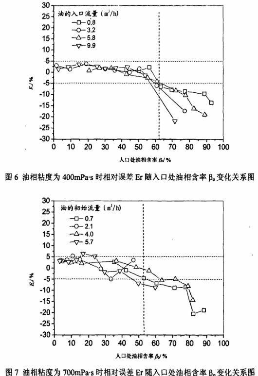 圖(tú)6和圖7分别給(gěi)出了油相粘(zhān)度爲400mPa·s和700mPa·s時相(xiang)對誤差随入(ru)口處油🏃🏻相含(hán)率的變化關(guān)系圖。可以看(kan)出,當βo達到50%~60%時(shí),誤差出現比(bi)較陡峭的下(xia)降,其整體誤(wù)差超過5%的界(jie)線,渦⭕輪流量(liàng)計超出😍了有(you)效工作區,而(ér)且,随着βo的增(zeng)加,絕對誤差(cha)也由正值變(biàn)成負值。