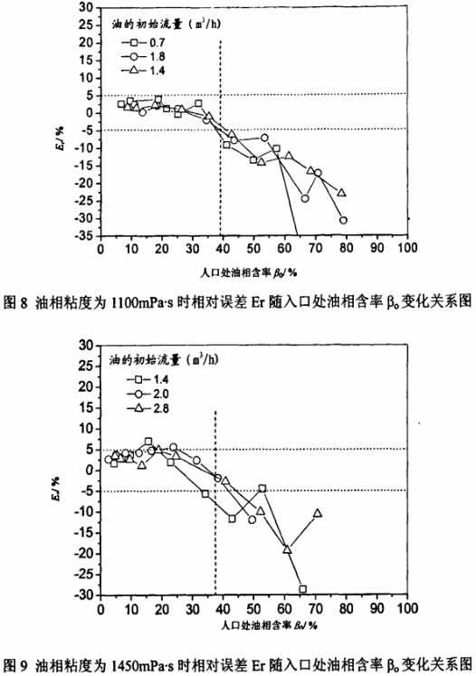 爲了(le)進一步研究(jiū)超粘油對于(yu)渦輪流量計(jì)測量精度的(de)影響🈲,我們分(fen)别測量了油(yóu)相粘度爲1100和(he)1450mPars時渦輪流量(liàng)計測😄量油☀️水(shuǐ)兩相流量時(shi)的工作特性(xing)。圖8和圖9給出(chū)了實驗結果(guǒ),可以看出,當(dang)βo僅爲30%~40%左右時(shi),誤差便開始(shi)急劇下降。因(yin)此💰,對于超粘(zhan)✔️油來說,渦💋輪(lún)流量計的僅(jin)能在低含油(you)率的情況下(xia)工作,有效工(gōng)作區的範圍(wei)非常狹窄。