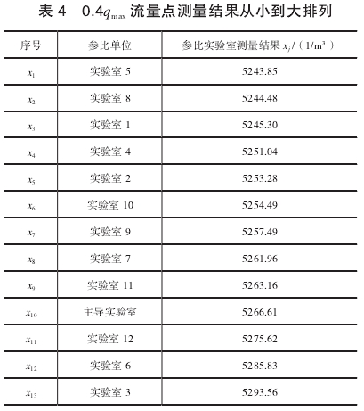可以(yi)判定實驗室(shi)3在0.4qmax流量點的(de)測量結果X13=5293.56不(bu)屬于異常值(zhí),不需要剔除(chu)。