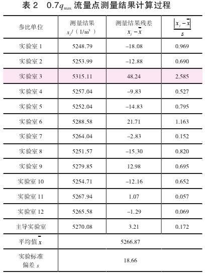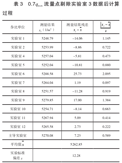 可以判定實(shi)驗室3在0.7qmax流量(liàng)點的測量結(jié)果屬于異常(cháng)值,需要剔除(chu)。剔除後,12組數(shù)據重複上述(shu)過程,計算結(jie)果如表3所示(shi),置信水平P=95%,即(jí)α=1-0.95=0.05,n=12,查格拉布斯(sī)準則的臨界(jie)值表得到G(0.05,12)=2.285,可(ke)以判斷無異(yì)常值。