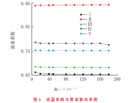 由圖6可(ke)知,雷諾數(shu)的變化對(duì)流量系數(shu)影響不大(da),說明🈚這幾(jǐ)種孔闆都(dōu)具有良好(hǎo)的穩定性(xìng)。外凹型孔(kǒng)闆II的流量(liang)系數比其(qi)他4種大,标(biāo)準孔闆I小(xiao);加厚型孔(kong)闆IV的流量(liang)系數曲㊙️線(xiàn)在較大及(jí)較小雷諾(nuo)數時變化(hua)明🔞顯,因此(cǐ)該類型穩(wen)定性稍差(cha);直邊型孔(kong)闆V穩定性(xing)好🔞。