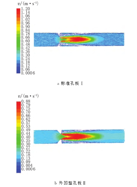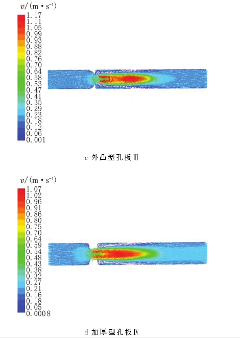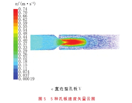 以ʋ=0.2m/s時(shí)孔闆的模(mo)拟結果爲(wèi)例,各孔闆(pan)流量計的(de)速度🥵矢量(liàng)雲圖💯見圖(tu)5.