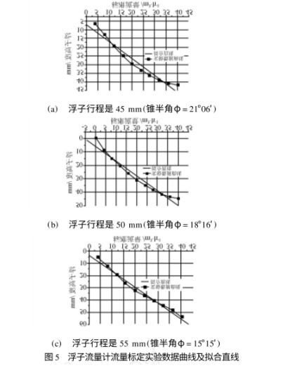 如圖3所示,(a)、(b),(c)分别(bié)是行程爲45mm,50mm和55mm的(de)浮子流量計浮(fú)子高☔度和流量(liàng)間對應關系曲(qu)線及利用最小(xiǎo)二乘法拟合的(de)直線.從表1.表2,表(biǎo)3中第三列所示(shi)的非線性誤差(cha)數據可以看出(chū),當利用公式(1)進(jin)行流量計算時(shi)在不同的流量(liàng)點處流量和浮(fu)子高度之間表(biǎo)❌現出了不同的(de)非線性誤差,流(liu)量和💰浮子高度(du)之間不是線性(xing)對應關系.